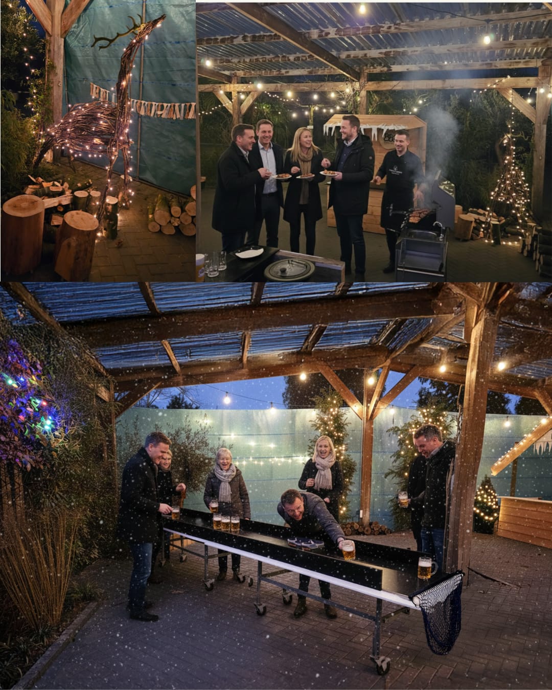 De tuin beschikt over 200 m² overdekte ruimte met bar, een sfeervolle hooiberg met bar en een heerlijk schaduwterras. Daarnaast is er een comfortabele ontvangstruimte met toiletten, waardoor alles aanwezig is voor een compleet verzorgd verblijf.